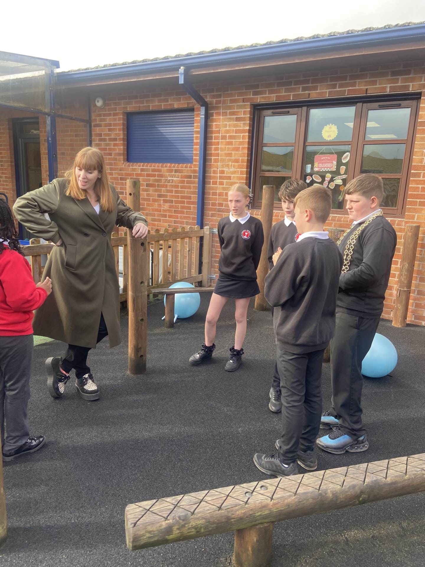 Angela received a guided tour from four Year 6 prefects, including the school’s mayor. They proudly showed her around the school, showcasing key areas such as the Special Educational Needs and Disabilities (SEND) provision, outdoor spaces, sensory room, sports hall, and classrooms from nursery to Year 6.